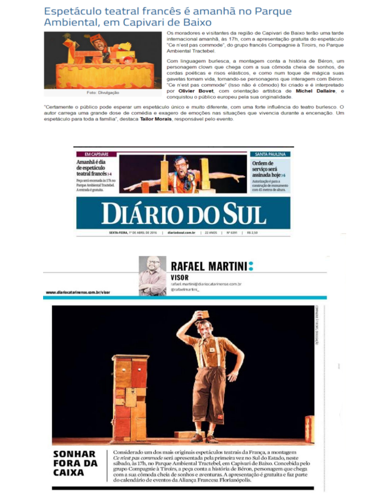 Etats Unis : Washington street Perfomance et Tatoo Festival à Norfolk Brésil : Alliance Française de Florianopolis. Festival Cena Cumplicidades à Olinda, Festival Internacional do Circo Contemporâneo, Porto Alegre, Fringe, Festival de Théâtre de Curitiba, Tournée dans les Sescs du département de Santa Catarina ; Belgique : Puppet Buskers, Gent Mouscron, Festival Les huluberlus Italie : Kinder Festival- Bolzano Angola : Alliance Française de Luanda Suisse : Festival d’Art de rue, Sion. Festival des Artistes de rue Vevey.