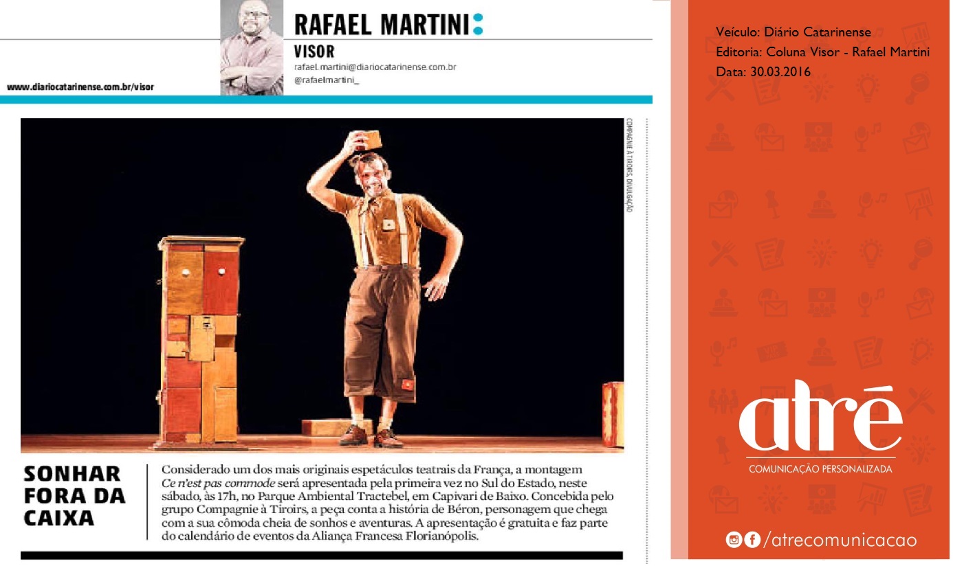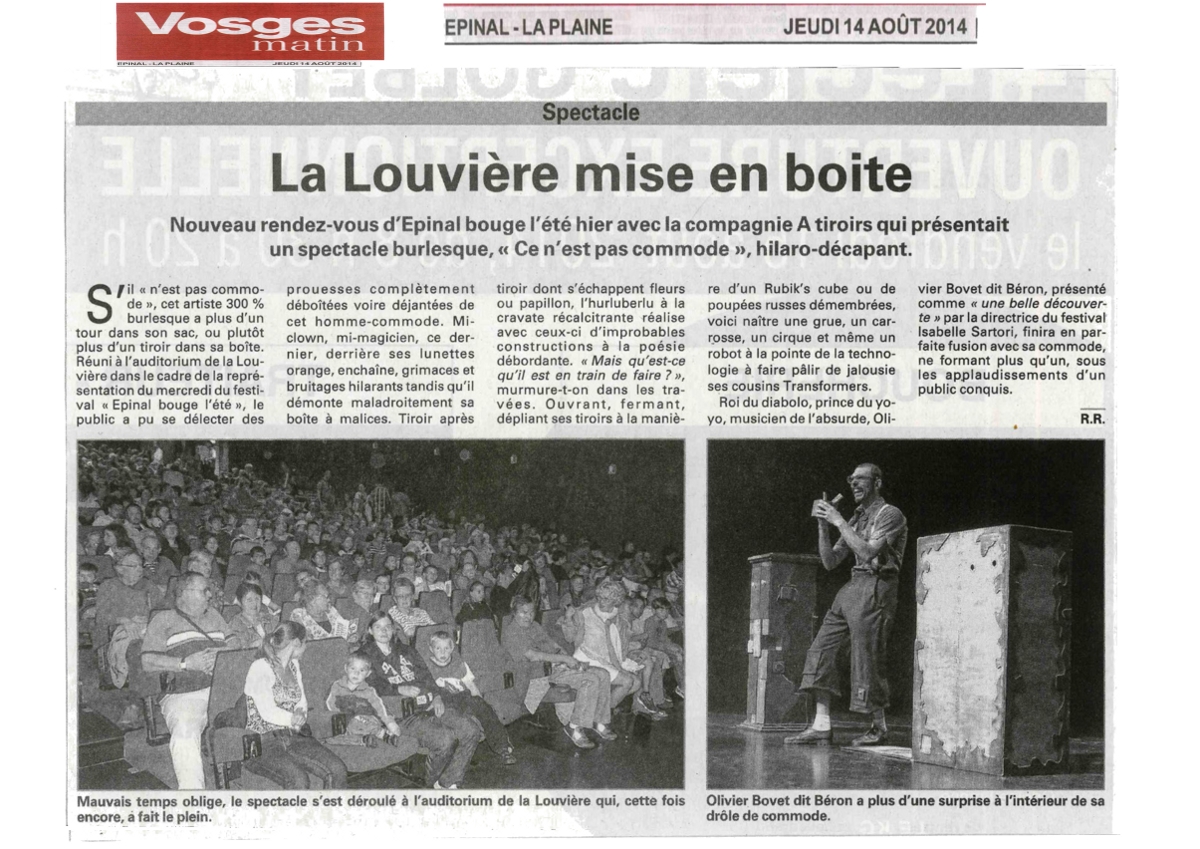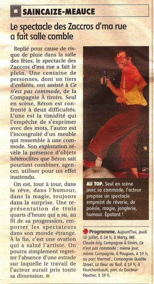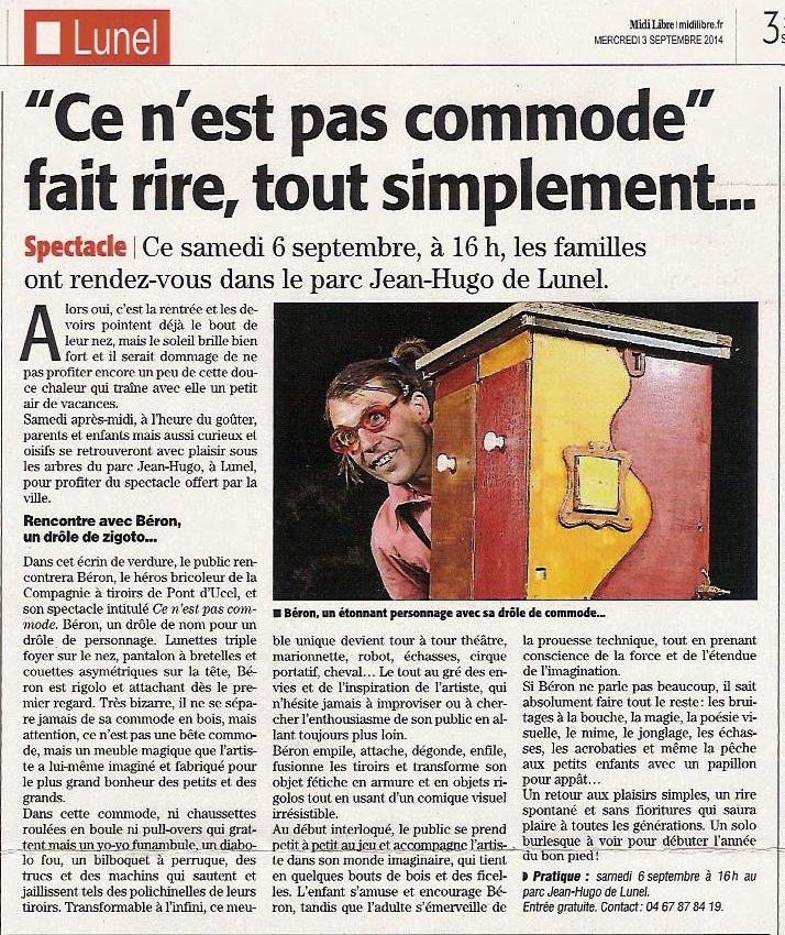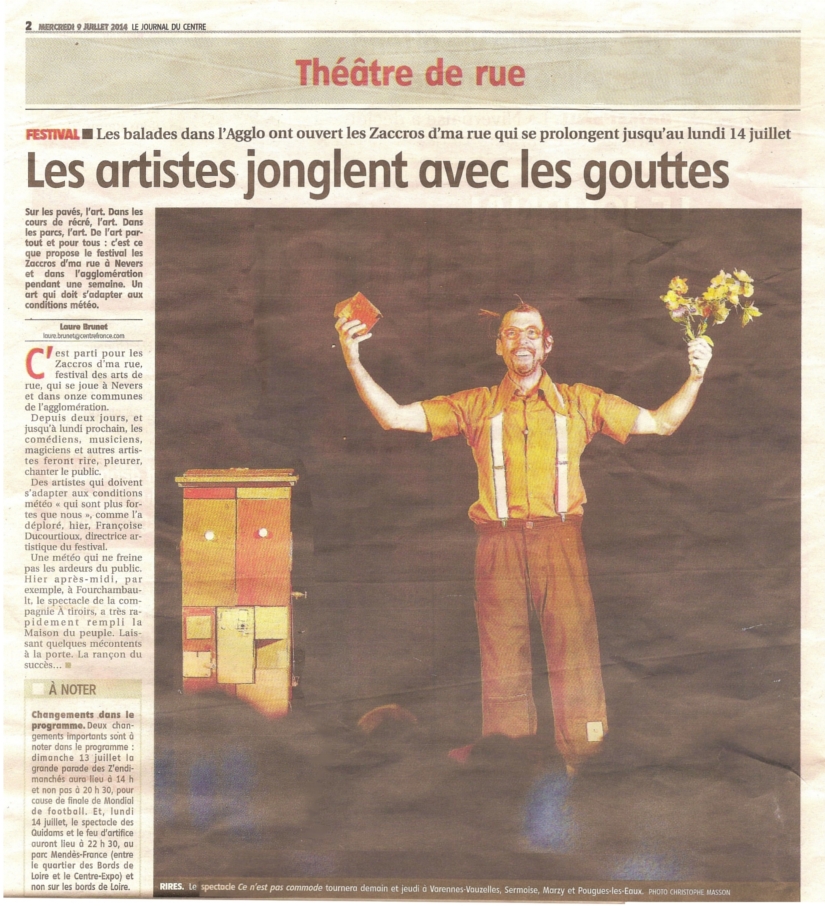 Le Public se délecte des prouesses complètements déboîtées, voir déjantées de cet homme-commode, mi-clown, mi-magicien. Derrière ses lunettes orange il a plus d’un tour dans son sac, ou plutôt plus d’un tiroir dans sa boîte, d’où s’échappent fleur ou papillon. L’hurluberlu à la cravate récalcitrante réalise d’improbables constructions à la poésie débordante. Roi du diabolo, prince du yoyo, musicien de l’absurde. Il finira en parfaite fusion avec sa commode !