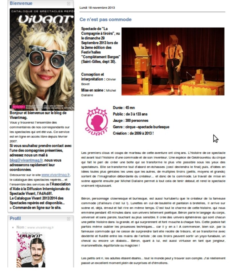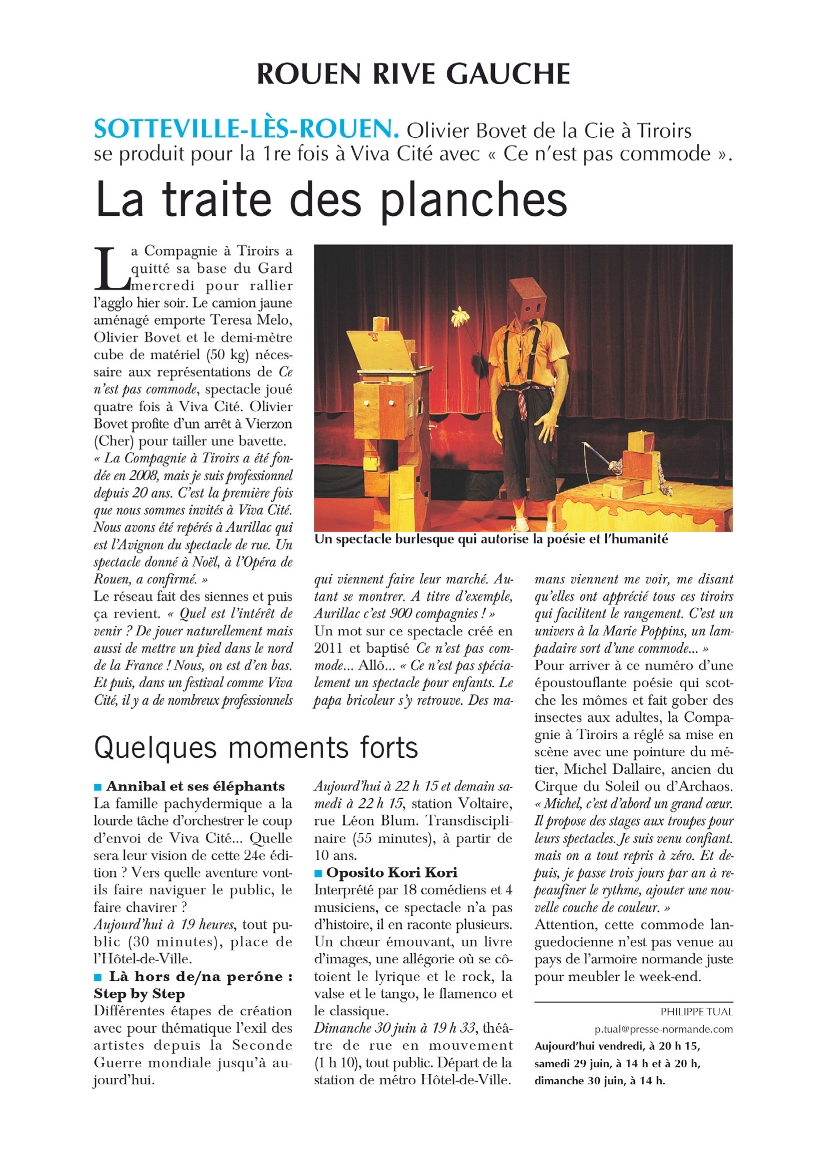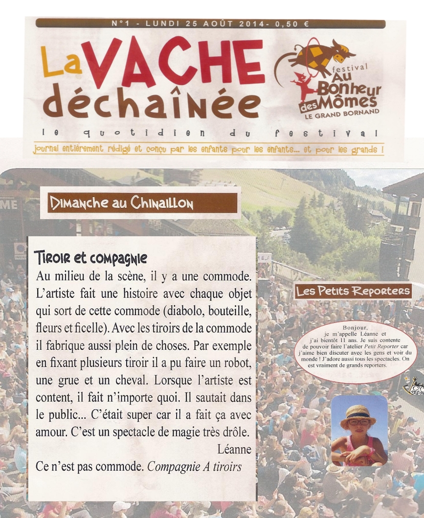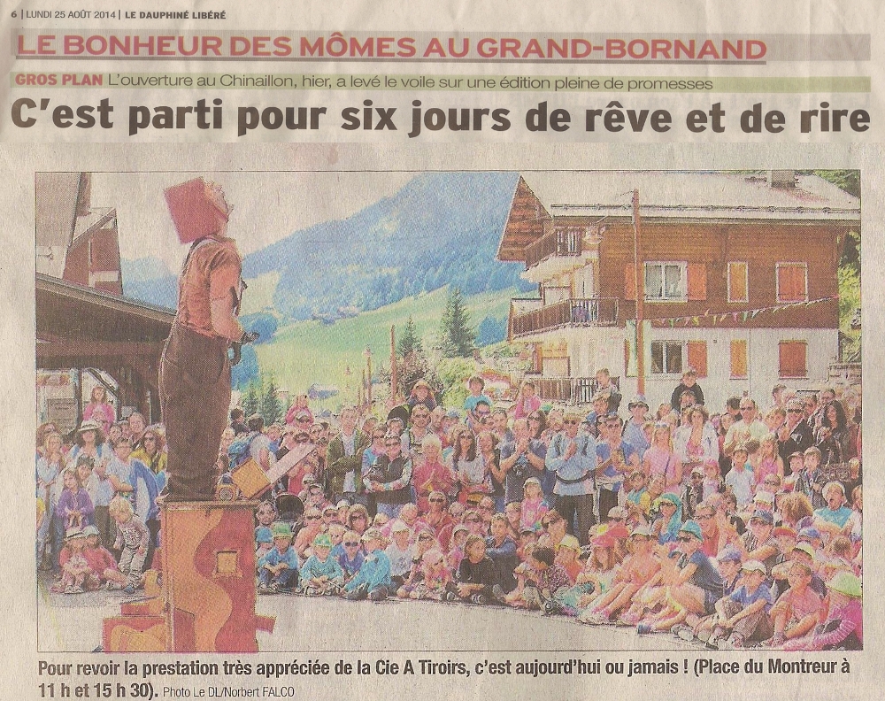 Musicalarue, Luxey ( 40), Clown, Marseille (13). Ideclick , Moirans-en-montagne – Rendez-vous des Petits Loups à Pornichet ( 44 ), Les Noctibulles, Scène Nationale, Annecy (74) – Musicalarue Luxey (40) – Zaccros de m’a Rue à Nevers (58) – Vive l’Art Rue ( Paris 13 eme. ) – Au Bonheur des Mômes , Grand Bornand (74) – Festival de Marionettes de Charleville Mezières – VivaCité à Sotteville-les-Rouen (76) – Guinguettes et Cies ( Essonne) – La Rue est vers L’Art ( 44 ) – Printemps des Rues, Paris (75) – Arrêt sur Rivage, Anglet (40) – Font’arts (84) – Festirues, Morcenx (40) – les Arts dans la Rue, Strasbourg (68). Épinal Bouge l’Été (88) – La Rue des Artistes, St Chamond (42) – Les Monts de la Balle (42) – Festival de rue d’Hérisson (03) – Festival d’Hiver, Montoir-de-Bretagne. Saison culturel de Neuvic (24) – Les Menuires ( 73) FOLs: Fol 57 et Fol 43, Fol 48 .. MJCs: Quimper, Metz, Chadrac…